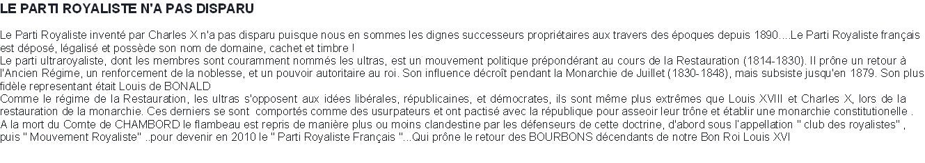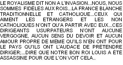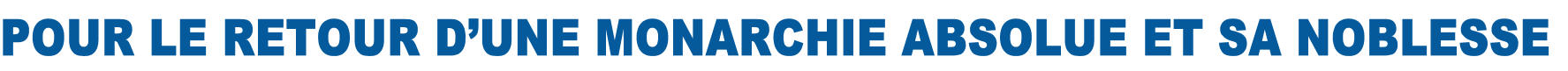 CE SITE EST OUVERT A TOUS LES ROYALISTES DE FRANCE QUI SOUHAITENT LE DÉPART DU RÉGIME RÉPUBLICAIN DÉMOCRATIQUE USURPATEUR APRÈS DEUX SIÈCLES DE MALHEURS ET DE DÉSILLUSIONS POUR LE RETOUR DE LA MONARCHIE ABSOLUE PARTICIPATIVE |