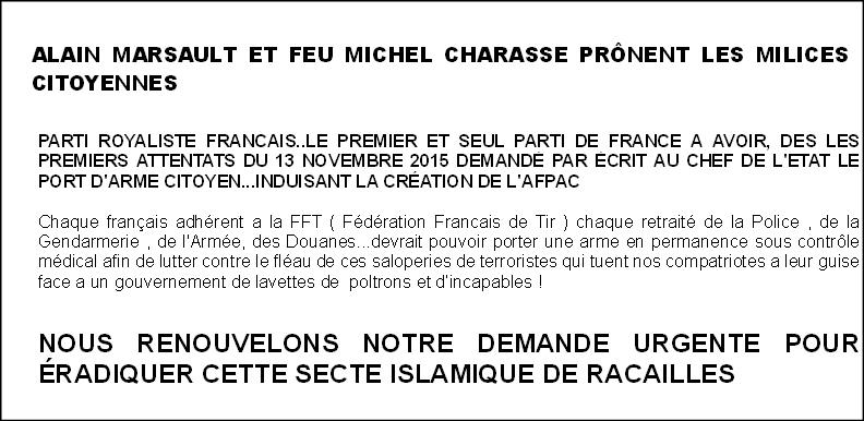 EN 21012 les dirigeants du Parti Royaliste Français ont proposé officiellement d’être échangés contres les otages francais par deux fois, tout en essuyant le même refus..la honte sans doute que sous ce régime aucun dirigeant de parti n’ait le courage d’en faire autant ...copie du courrier ci dessous |